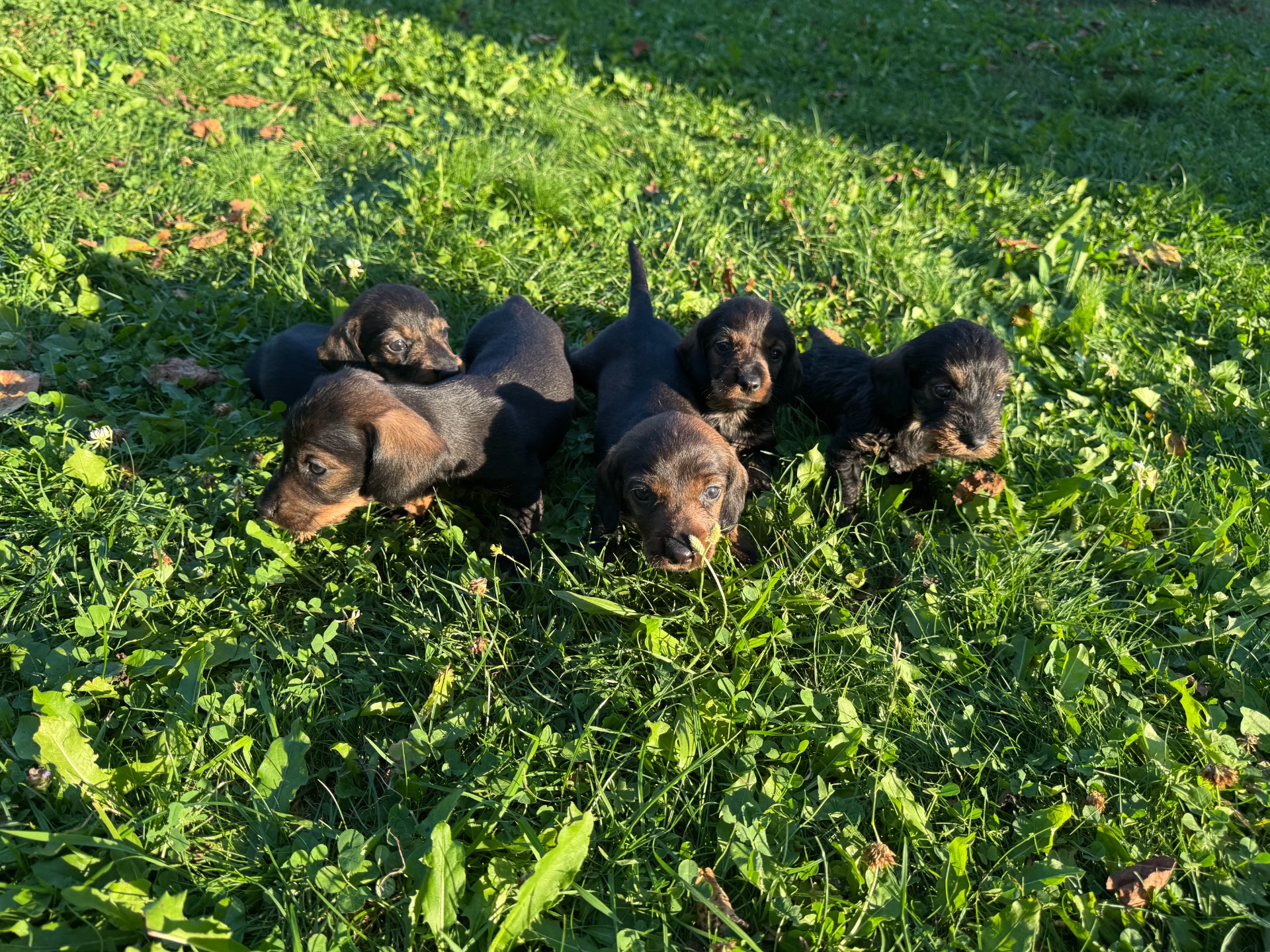 Krásná štěňata jezevčíka drsnosrstého. Ideální do lesa i do rodiny. Štěňata jsou socializovaná a připravená na nový domov. K odběru: od 27. 8. K dispozici: 4x pes v barvě divočák