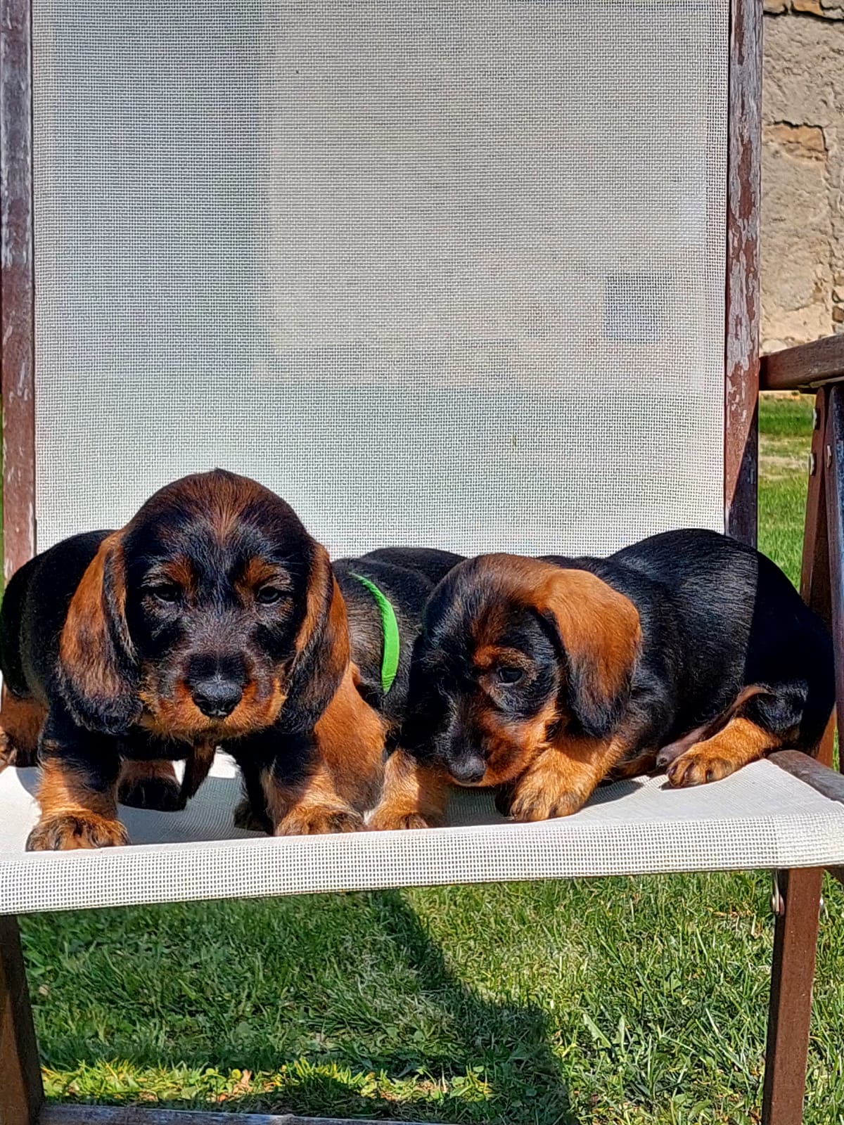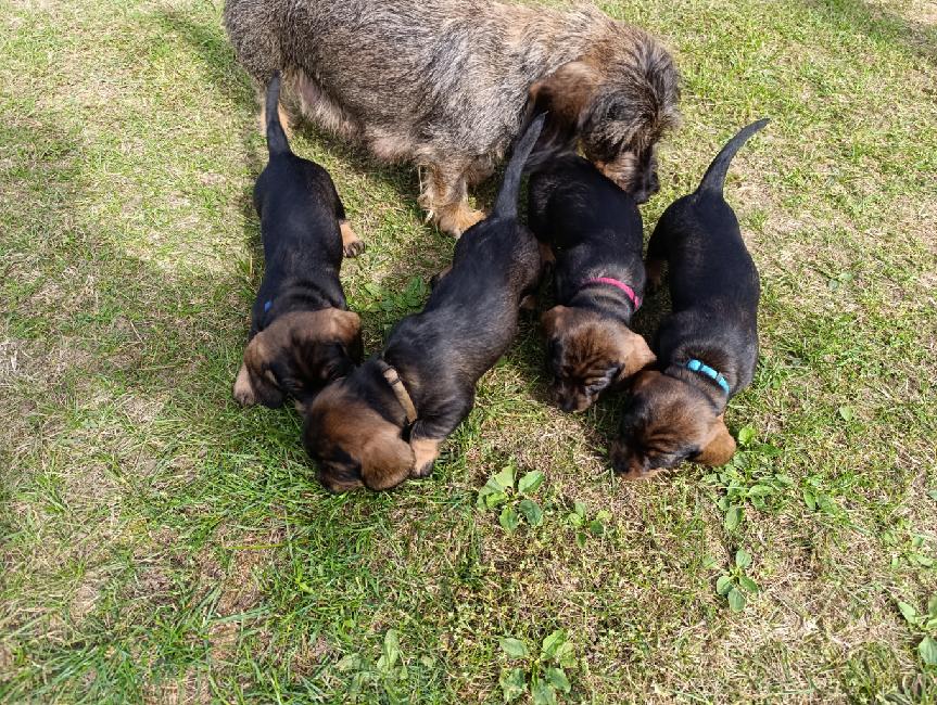 Krásná štěňata jezevčíka drsnosrstého. Ideální do lesa i do rodiny. Štěňata jsou socializovaná a připravená na nový domov. K odběru: od 27. 8. K dispozici: 4x pes v barvě divočák