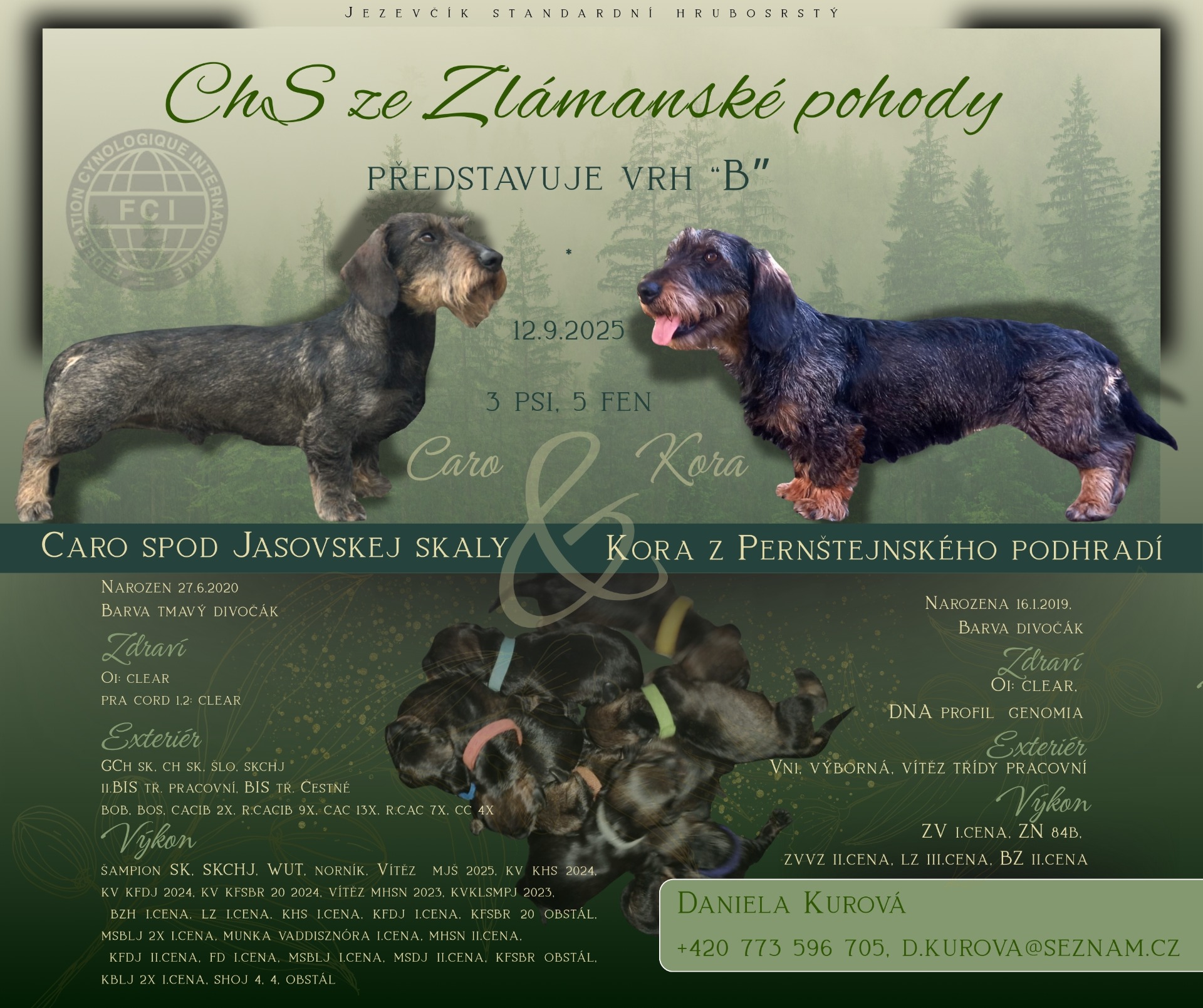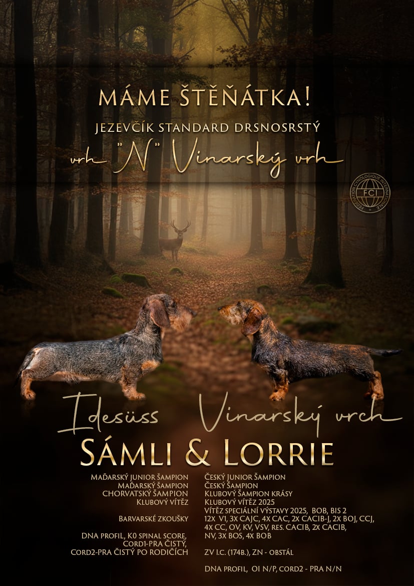CHS Vinarský vrch zadá štěňátka jezevčíků drsnosrstých standartních ze zahraničního krytí - pouze pejsky. Máma - Lorrie Vinarský Vrch - fena s mimořádně úžasnou povahou, velmi úspěšná jak výstavně tak i pracovně. Získala mnoho výstavních ocenění, má složeny zkoušky vloh v I.ceně a ZN,více zde: https://databaze.kchj.cz/detail/0/111185-lorrie_vinarsky_vrch/Otec štěňátek je pes z Maďarska Idesüss Sámli, se skvělou povahou, který získal také mnoho výstavních ocenění, má složeny barvarské zkoušky.https://idesuss-kennel.hu/idesuss-samli/Matka Sámliho je světovou vítězkou z roku 2018, a také získala titul WUT - světový vítěz na Světové výstavě jezevčíků v roce 2018. Jeho otec získal titul Světový vítěz mladých.Titulem WUT Světové vítězky, BOB ze Světové výstavy jezevčíků Itálie z roku 2016 se pyšní i máma naší Lorrie Vinarský vrch - Holly Vinarský Vinarský vrch. Otec Lorrie získal šampiony mnoha zemí a byl vynikající pracovní jezevčík. Kontakt: 602719210