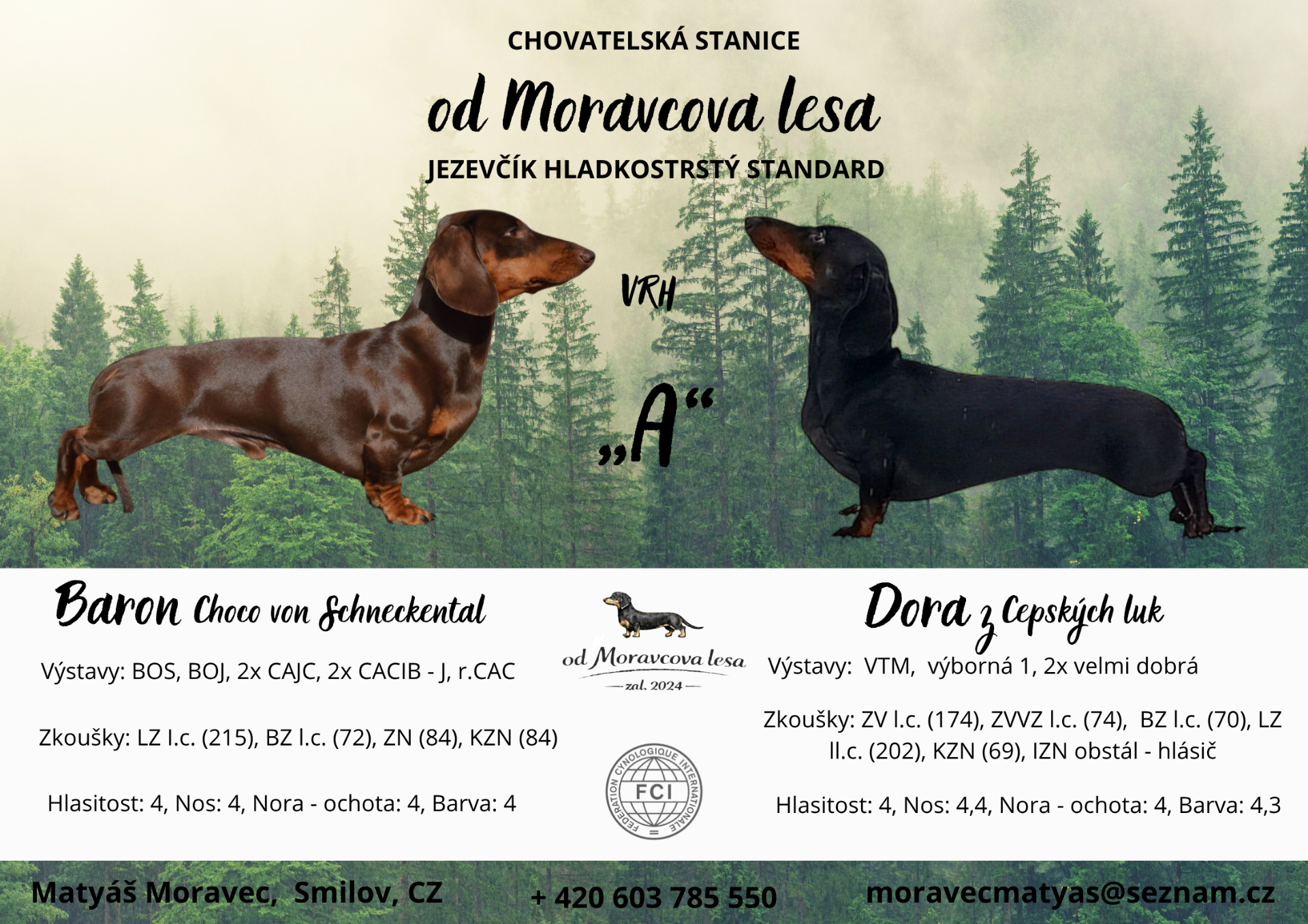 Přijímáme rezervace na štěňátka jezevčíka hladkosrstého standardního! V polovině dubna očekáváme náš první vrh. Z naší CHS od Moravcova lesa. Štěňátka budou v barvách černá s pálením a hnědá s pálením. Předpokládáme vyrovnané povahy a dobré pracovní vlohy. Štěňátka budou odchována v domácím prostředí s důrazem na socializaci.