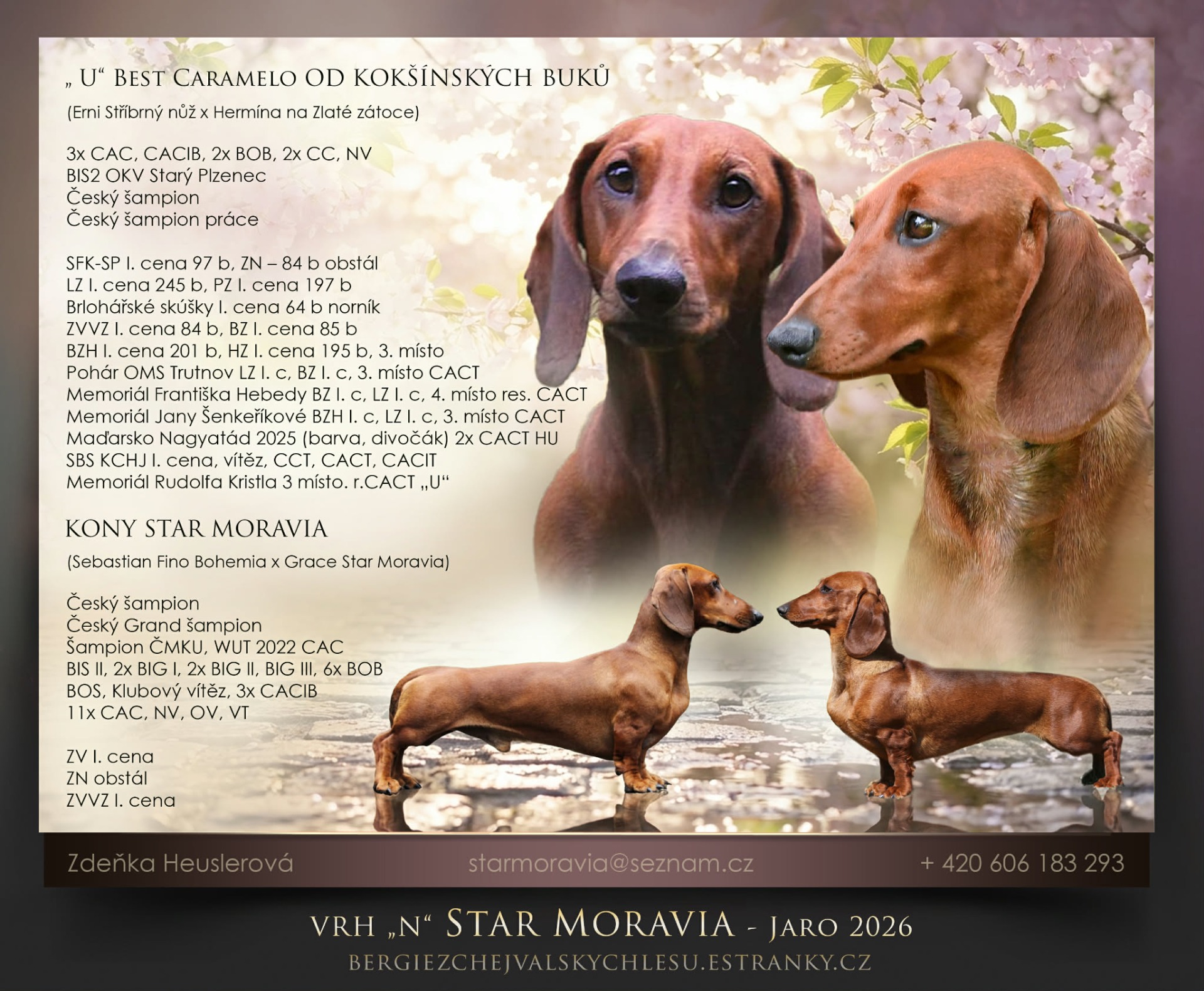 CHS Star Moravia nabízí k rezervaci štěňátka po pracovně i výstavně úspěšných rodičích. K odběru ke konci května 2026. Kontakt: Zdeňka Heuslerová, starmoravia@seznam.cz, tel +420 606 183 293